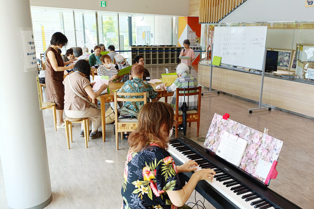 活動は毎月第1木曜10時~12時、参加費は300円。最近では、軽い体操を行い、お菓子・お茶を食べながらのおしゃべり、トランプ・百人一首などのゲーム、最後にコーラスをしています。ただし特に決まった流れはなく、塗り絵・折り紙・工作・押し花・絵手紙・脳トレなど、参加者の希望に添った活動をしています。また、3ヶ月に一度のお誕生会や、ミニコンサートもしているそうです。