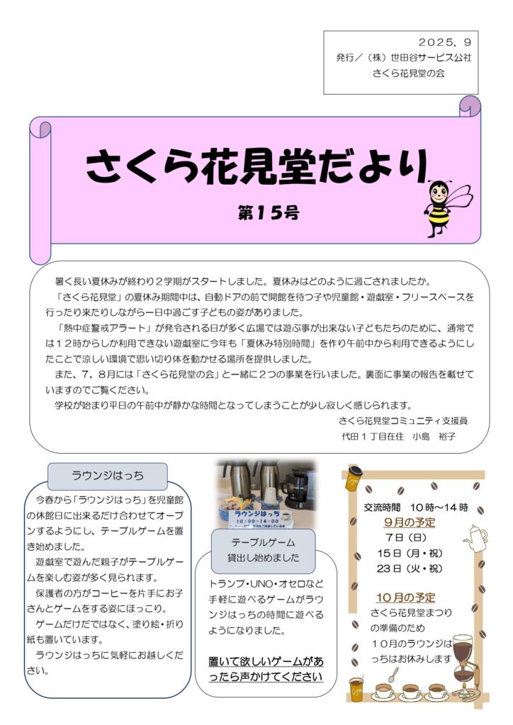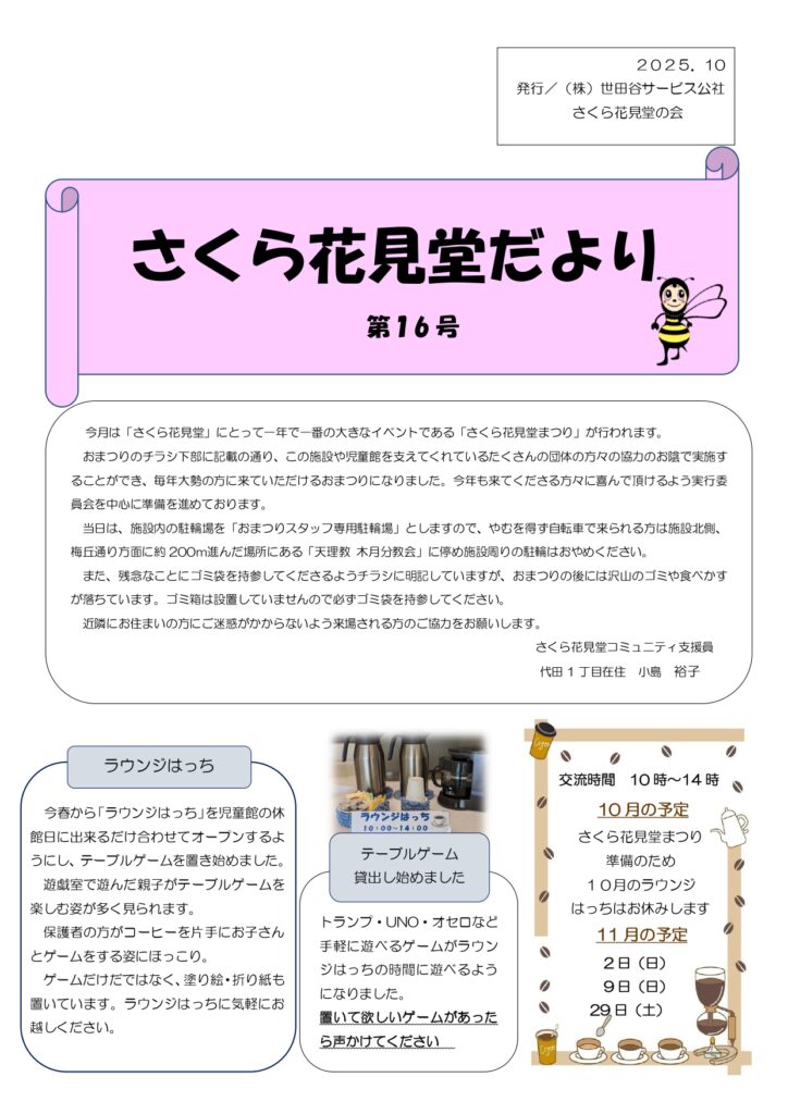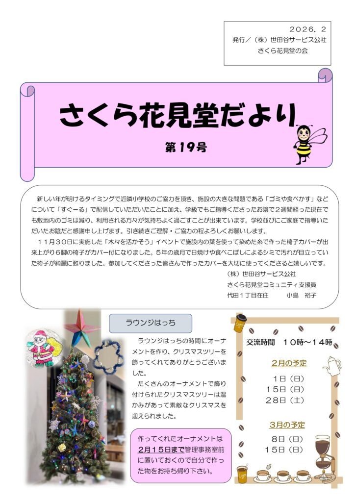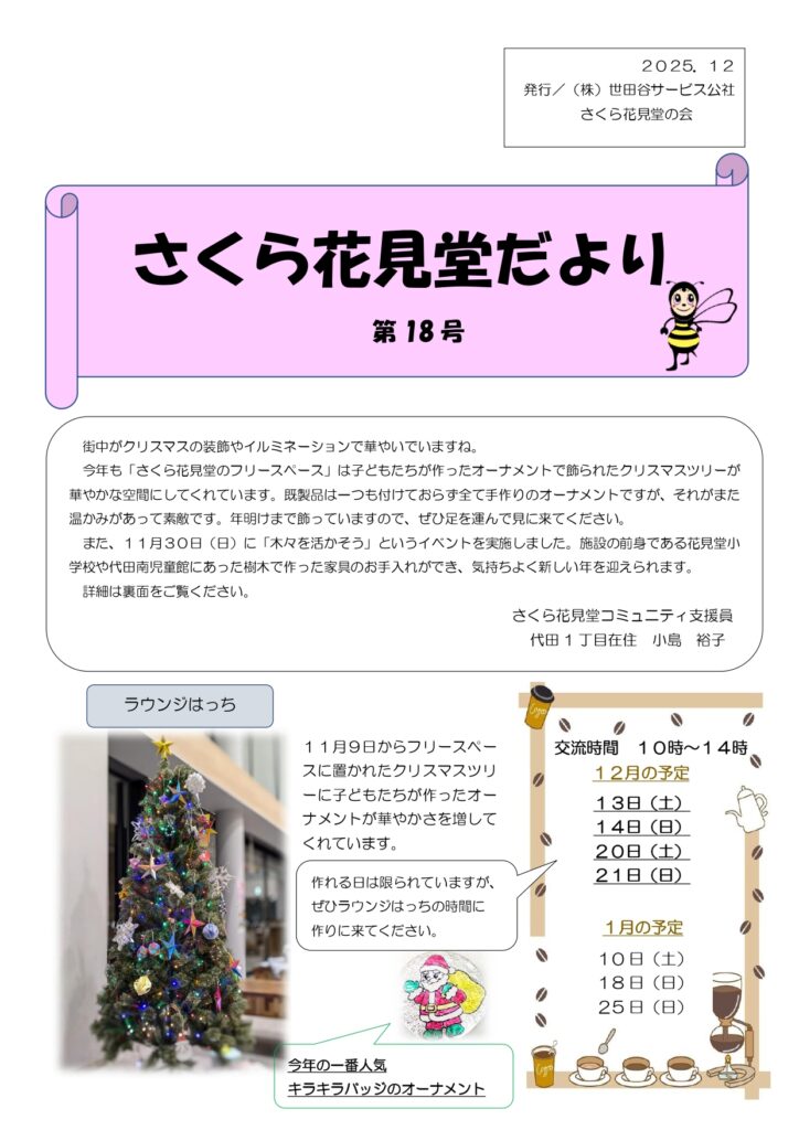 ホーム さくら花見堂だより さくら花見堂のタイムリーな話題を、コミュニティ支援相談員の小島さんがとりまとめて毎月1回発行しています。「ラウンジはっち」の予定も掲載されています。印刷したものはさくら花見堂で配布していますので、ご希望の方は事務室までお問い合わせください。
